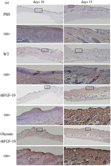 For clinical observation and histological analysis of skin regeneration, mice were randomly selected from each group and euthanized on days 10 and 15. Figure 5a shows the hematoxylin and eosin (H&E) stained histology for the four treatment groups. On day 10, in rhFGF-10 and oleosin-rhFGF1-10 groups, the wound areas had begun to close and we could observe the regeneration of the epidermis. On the other hand, regeneration was not complete in the rhFGF-10 groups, which showed fewer hair follicles and other skin appendages. On day 15, the wounds had failed to heal perfectly in the PBS and WT groups, but in the oleosin-rhFGF-10 and rhFGF-10-treated groups, complete regeneration of the skin structure was seen. However, the hair follicles and blood vessels had regenerated and were well-integrated with surrounding regions. The connectives tissue was dyed red in the oleosin-rhFGF-10 group deeper than in the rhFGF-10 group.