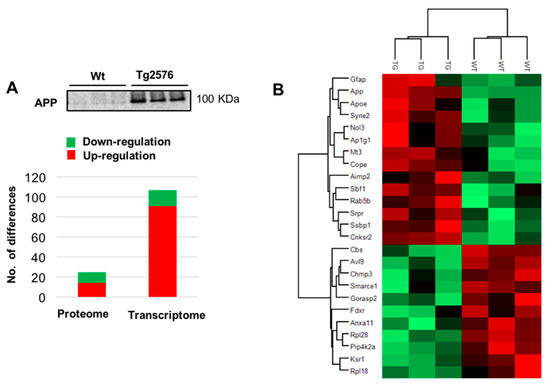Female Tg2576 transgenic mice were used [3]. Animals were housed 4–5 per cage with free access to water and food, and they were maintained in a temperature-controlled environment on a 12 h light–dark cycle. The progressive development of AD signs in our colony has been previously described [51]. Animal care procedures were conducted in accordance with the European Community Council Directive (2010/63/EU, 22 September 2010) and approved by the local ethics committee. Twelve aged animals (6 WT and 6 Tg2576 mice of 18 months of age), divided into two sets, were used for proteomics and transcriptomics analysis (3 mice/group/platform).