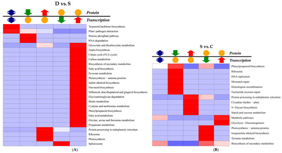 Correlation analysis of the KEGG pathway between transcription and proteomics suggested that terpenoid backbone biosynthesis and the plant–pathogen interaction pathway showed significant differences in the D vs. S group (Figure 8A); No notable differences in these pathways were observed in the S vs. C group (Figure 8B), however, 13 pathways were obviously different in the D vs. C group (Figure 8C), with phenylpropanoid biosynthesis, biotin metabolism, and fatty acid biosynthesis showing the most significant differences. Correlation analysis of the KEGG (Kyoto encyclopaedia of genes and genomes) pathway in C vs. R group and S vs. R group were shown (Figures S4 and S5).