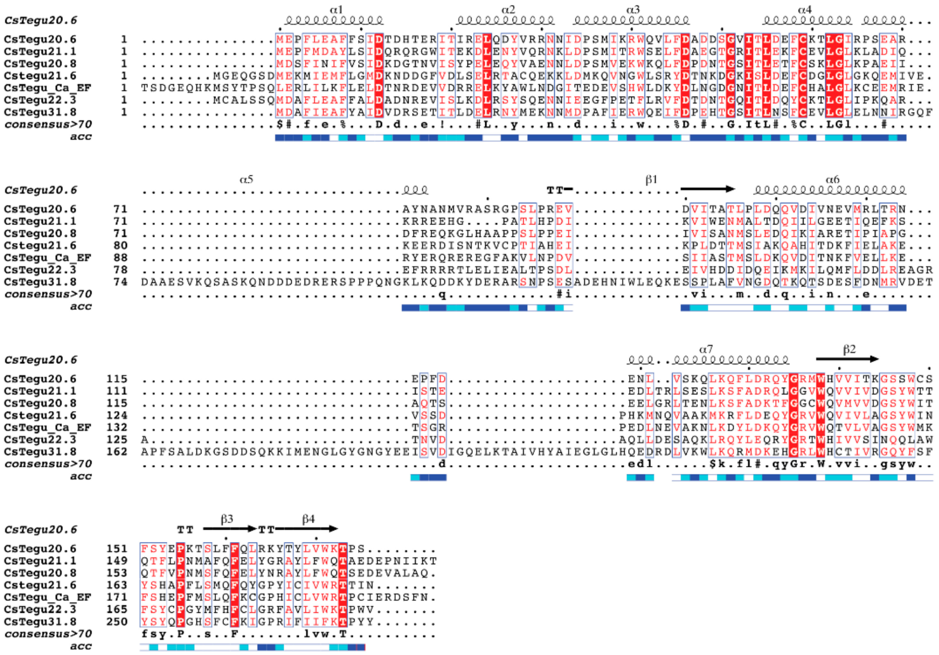 Secondary structure elements and the structure topology of CsTegu20.6 were analyzed using ProFunc [68]. The deconSTRUCT [40] and DALI [42] were employed to detect the aligned regions of proteins based on structural similarities. The oligomeric state of the structure was predicted using GalaxyGemini [44], with subsequent energy minimization. All structure visualization was performed using UCSF Chimera [69] and PyMOL v.099rc6 (http://www.pymol.org).