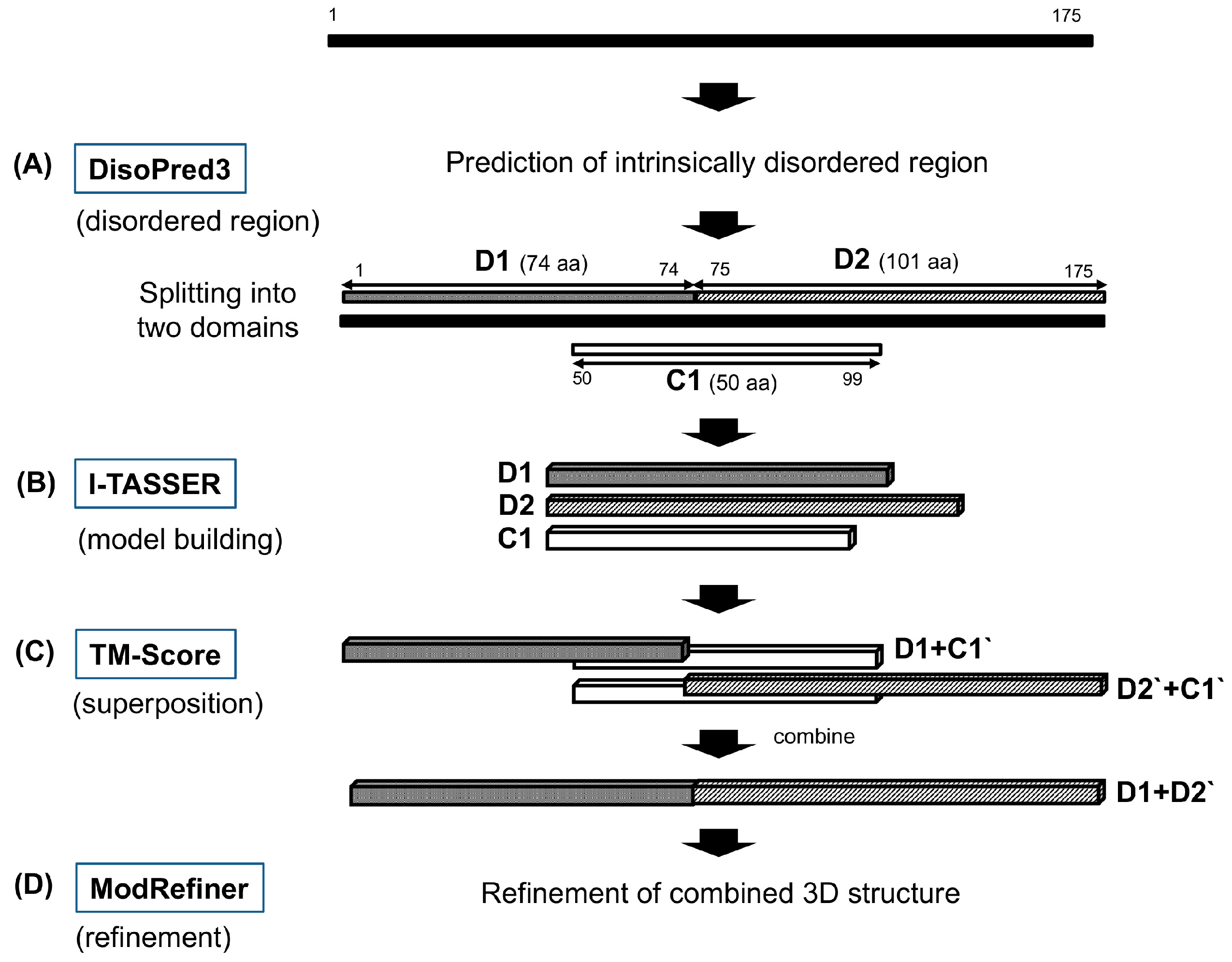 Although the 3D structure of CsTegu20.6 was modeled using Swiss-Model [23] and I-TASSER [24], the optimal 3D structure was not constructed because of the unavailability of appropriate templates. Therefore, we used a modified method to obtain the full-length and refined structures of the CsTegu20.6 protein (Figure 1) as follows: (1) the CsTegu20.6 protein sequence was split into D1 and D2 domains based on the disordered region predicted by DisoPred3 [66] (Figure 1A); the C1 fragment was selected as a bridge in order to later combine the two domains; (2) the 3D structures of D1, D2 and C1 were modeled using I-TASSER [24] (Figure 1B); (3) the residue numbers of the D2 domain and the C1 fragment were readjusted to the original numbers in the sequence, renaming them as D2′ and C1′, respectively. Each domain and C1′ fragment was superposed using the TM-Score [29]. Both D1 and D2′ were aligned to the C1′ fragment using the TM-Score so that D1 and D2′ were correctly oriented 5′ to 3′ with respect to each other. Then, the full-length structure was obtained by combining each superposed structure, from which the C1′ fragment was removed manually (Figure 1C); (4) The low free-energy conformations of the combined full-length structure were refined by full-atomic simulations using ModRefiner [30] (Figure 1D). The additional refinement process was performed in two stages. First, the loop regions aa13–20, aa74–88 and aa145–154 were refined by GalaxyLoop [32] using the ‘PS1tbm protocol’ scoring method. Then, both the backbone and side chain of the structure were refined using GalaxyRefine [33] incorporating the “both mild and aggressive relaxation” method.