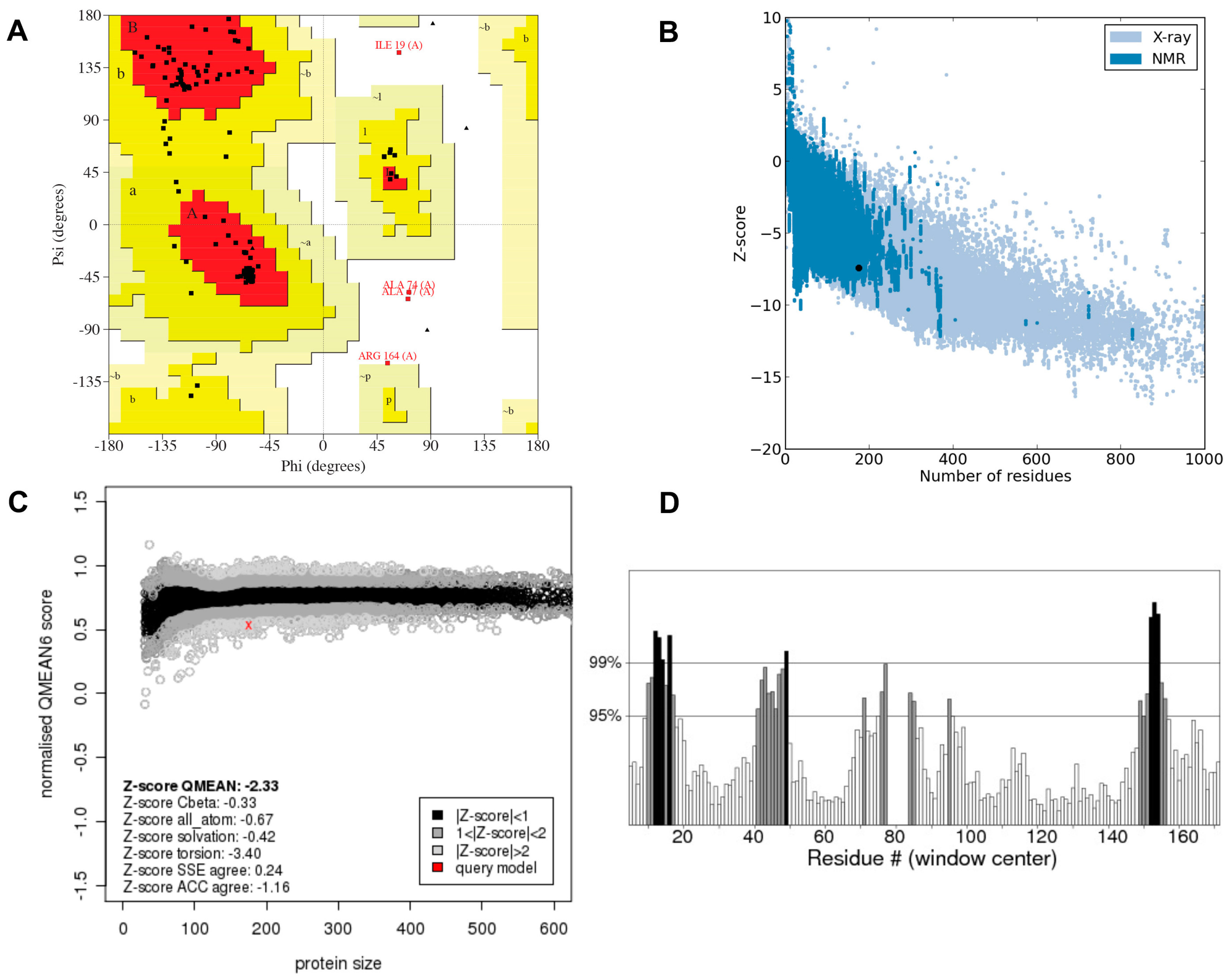 Structural evaluation and stereochemical quality assessment were performed using several evaluation and validation tools both before and after refinement. The potential errors in the 3D models were evaluated using Ramachandran plots [34] obtained from PROCHECK [67], ProSA [35], QMEAN [36] and ERRAT [37].