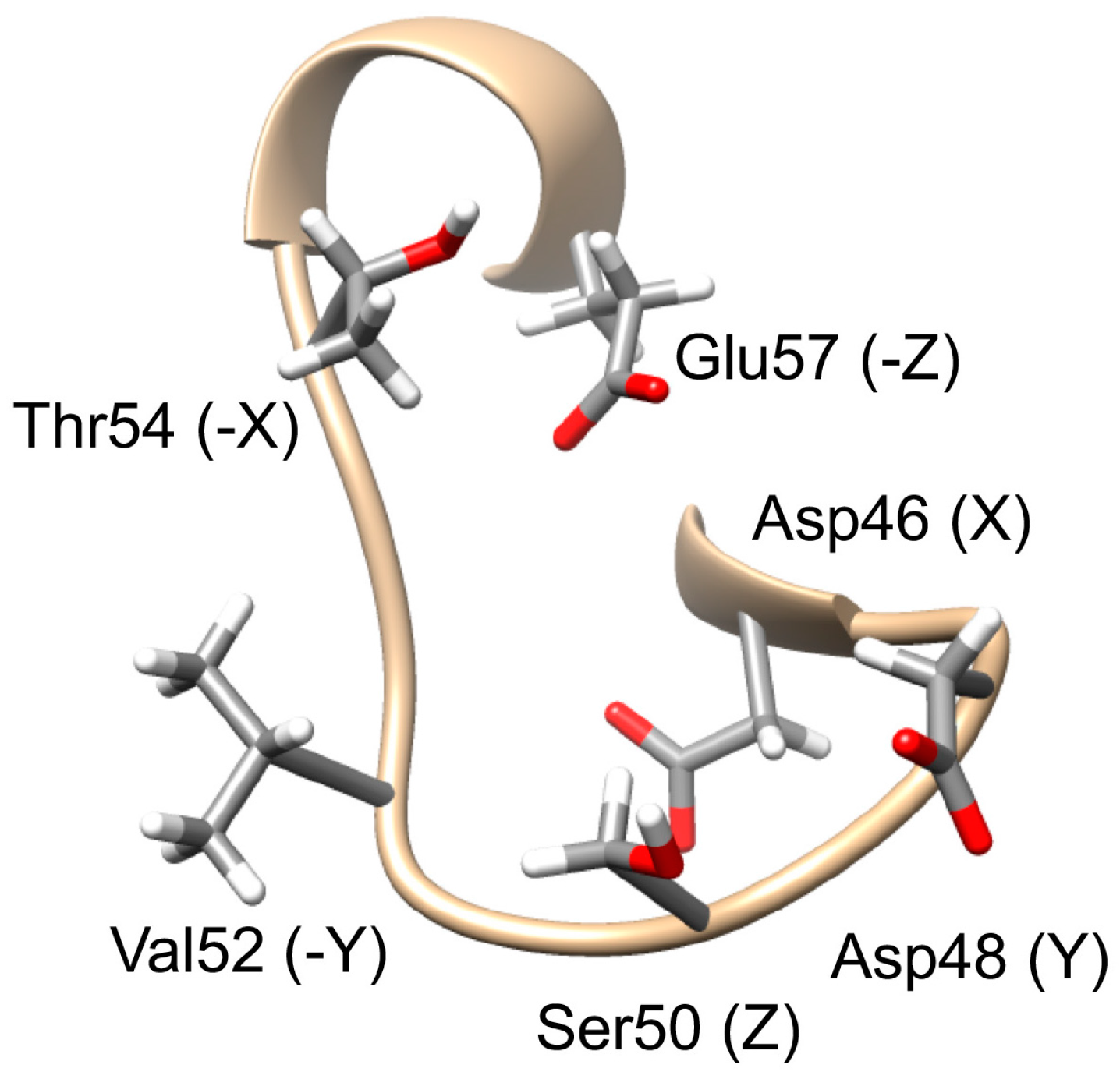 EF-hand calcium-binding site. The Ca2+-binding site of CsTegu20.6 was predicted from that of Rattus norvegicus (PDB ID: 1XVJ_A). The consensus binding residues are Asp46, Asp48, Ser50, Val52, Thr54 and Glu57, and the labels are indicated in parentheses. Side-chain oxygen and hydrogen atoms were colored in red and white, respectively.