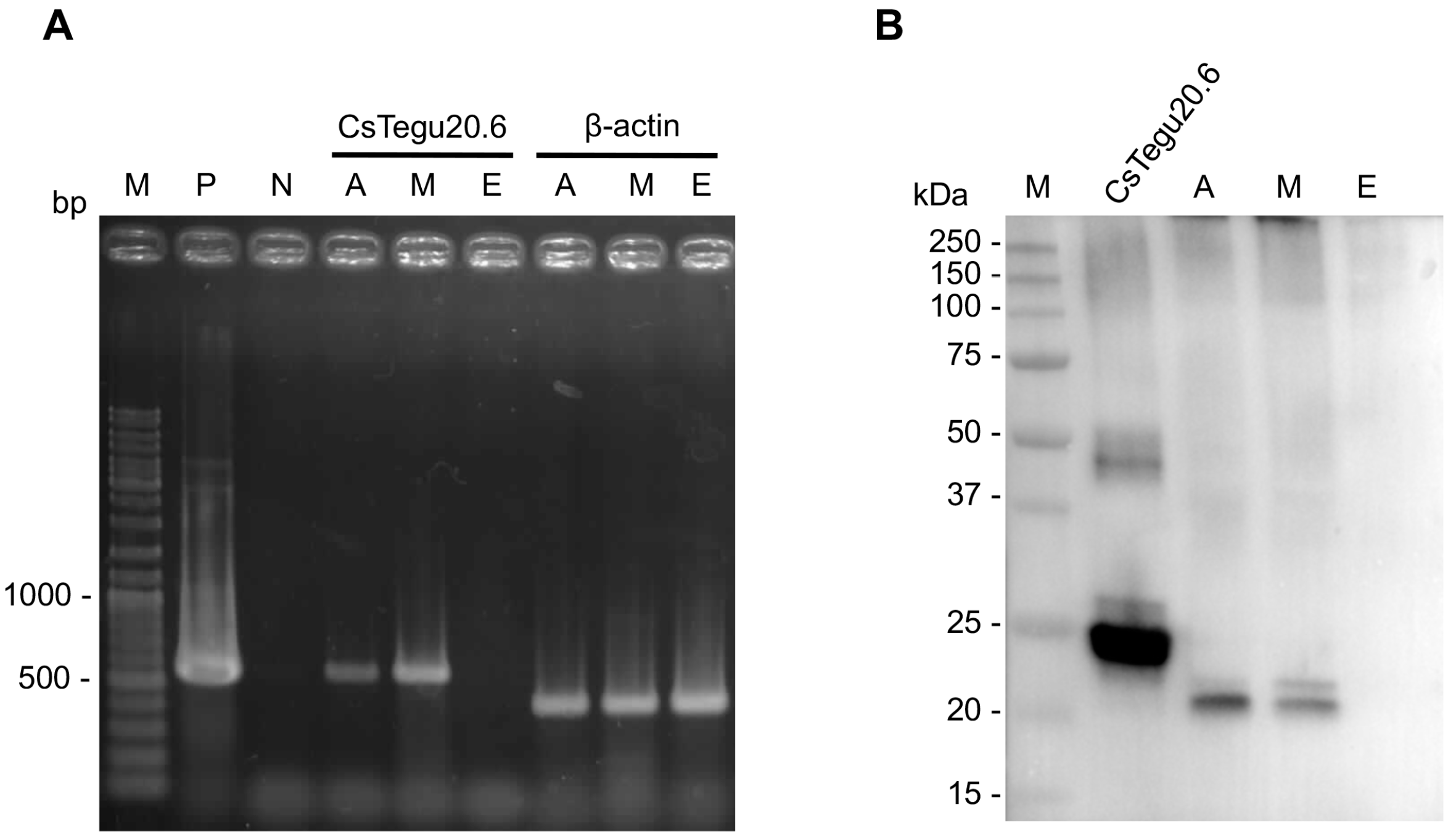 Transcriptional and protein analysis of CsTegu20.6 across C. sinensis developmental stages. (A) PCR was performed using specific primers for the complete coding sequence of CsTegu20.6; (B) expression of the native CsTegu20.6 was confirmed in adult worm and metacercariae using anti-rCsTegu20.6 sera. M, DNA markers; P, positive control; N, negative control; A, adult worm cDNA library; M, metacercariae cDNA library; E, egg cDNA library.