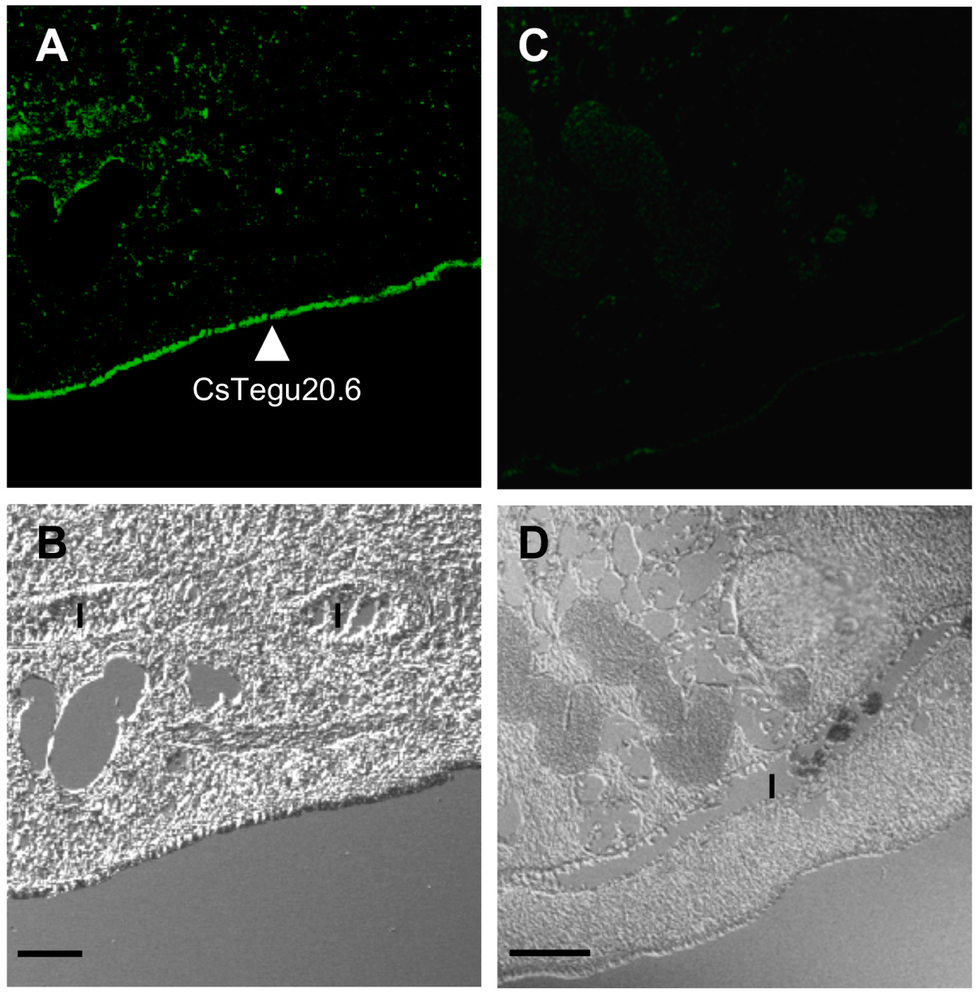Immunohistochemical localization of CsTegu20.6 in C. sinensis adult worm. An adult fluke (×100) stained with 1:200 diluted FITC-conjugated anti-rat IgG antibody showed intense staining in the outer surface of the tegument ((A,B), closed arrowhead); Non-immunized rat sera were used to make a negative control (C,D). The upper images showed the tegument and underlying tissues of adult worm under fluorescence microscope. The lower images showed the same part under optical microscope. Scale bars indicate 50 μm. I, intestine.