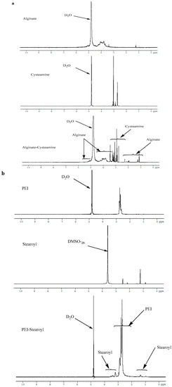 The 1H-NMR spectra for all reaction products were recorded using Varian Unity-600 (600 MHz) NMR spectrometers (Varian, Inc., Palo Alto, CA, USA). Alginate, PEI, bAPSC, and cysteamine dissolved in D2O and stearoyl acid dissolved in DMSO-d6 were analyzed through NMR spectrometry.