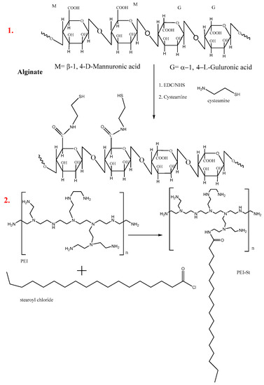 Alginate thiolation was achieved through amide bond formation between the activated carboxyl group of the alginate and amino group of the cysteamine by using EDC and NHS [45]. Briefly, sodium alginate (200 mg) was dissolved in 50 mL of MES buffer (0.1 M, pH 5.5) and reacted with EDC (86 mg) and NHS (64.5 mg) at room temperature for 6 h. Cysteamine was added to the aforementioned solution at an alginate-to-cysteamine ratio of 2:1; the reaction was continued for 24 h under stirring at room temperature. The resultant solutions were dialyzed for 2 days to remove byproducts and uncoupled compounds and were then lyophilized. The alginate–cysteamine conjugate was stored at 4 °C until further use. The chemical structure of thiolated alginate was confirmed through FTIR and 1H-NMR.