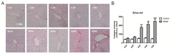 The body weight of the model group was obviously less than the corresponding control group from the 10th day to 50th day. Conversely, the liver index of the model group was significantly higher from day 10 to day 50. The food intake of SD rats was similar among the groups from day 10 to day 50 (Table 1).