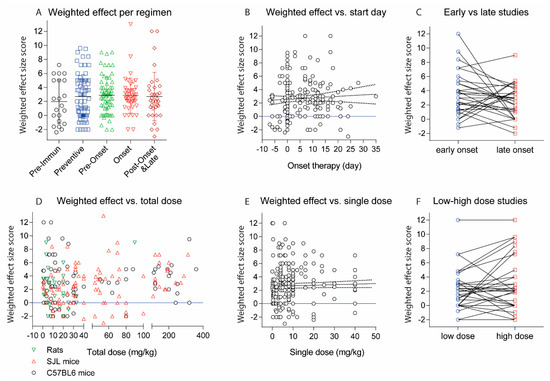 In humans, single doses of monoclonal antibodies in MS patients range from 1–2 mg/kg for daclizumab, 3–6 mg/kg for natalizumab, 1, 3 or 10 mg/kg for alemtuzumab and 10–15 mg/kg for rituximab. Hence, translated to mice, one may consider a single dose of 1–15 mg/kg as a reasonable start, and most studies used doses in this range (92 studies with 181 experiments). There was much less consensus in terms of the dosing frequency, intervals and start of treatment. Particularly the latter ranges from 7 days before immunization [33,37,38] up to 35 days after active immunization [39]. The heterogeneity of treatment schedules is illustrated in Figure 2, Figure 3 and Figure 4 for PP-EEA in C57Bl6 mice, RR-EAE in SJL/J mice and for adoptive transfer models, respectively. Twenty-eight studies compared effects of different treatment regimens (Figure 5A), but in contrast to small molecular MS drugs, which normally show stronger efficacy on preventive (i.e., early) therapy, there was no significant association between onset of therapy and observed efficacy (Figure 5A–C). Instead, experiments employing pre-immunization or pre-adoptive transfer regimens had a high rate of unfavorable worsening outcomes (8 out of 30 experiments), which could not be explained by targeting protective proteins or cells.