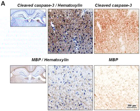 The coronal brain sections used in this study were selected from the brain segment located within the midline of the circular craniotomy, which corresponded to the impact zone representing reproducible injury profiles in all major brain regions affected by focal CCI injury, including the cortical core lesion and penumbra as well as regions that are not directly impacted, such as the thalamus [38,39,94,95]. Immunohistochemistry on paraffin-embedded 4-µm coronal sections from stereotaxically corresponding thalamic regions from a brain segment positioned within the midline plane of impact site (between −3.8 mm and −2.8 mm from bregma) was performed as detailed in our previous study [38,39,96] with minor modifications. In this study, the following primary antibodies with dilutions 1:500 or 1:1000 depending on applications were used: (1) rabbit polyclonal anti-cleaved caspase-3 (Asp175) (Cat# 9661; Cell Signaling Technology, Danvers, MA, USA); (2) mouse monoclonal anti-rat blood-brain barrier [endothelial barrier antigen (EBA)] (Cat #SMI-71R, BioLegend, San Diego, CA, USA); and rabbit anti-myelin basic protein (MBP) (Cat# AB5864, EMD Millipore, Billerica, MA, USA). According to manufacturer’s data, cleaved-caspase-3 (Asp175) antibody detects endogenous levels of the large fragment of activated caspase-3 (17/19 kDa) resulting from cleavage adjacent to Asp175 and this antibody does not recognize full length caspase-3 (35 kDa) or other cleaved caspases. For the quantitative immunohistochemical experiments we used biotinylated secondary antibodies and avidin-HRP conjugate (LSAB+ kit, Cat #K0679, Dako, Carpinteria, CA, USA). Immunostaining was visualized with 3,3′-diaminobenzidine (DAB) for brown color development and sections were counterstained with hematoxylin (Dako, Carpinteria, CA, USA). To visualize myelin and brain tissue pathology, the sections were stained with luxol fast blue and counterstained with cresyl violet using a commercially available kit (NovaUltra™ Luxol Fast Blue Stain Kit, IHC WORLD, LLC, Woodstock, MD, USA). For the immunofluorescence triple-labeling experiments, the following species-specific secondary antibodies conjugated with Alexa Fluor dyes (all from Thermo Fisher Scientific, Waltham, MA, USA) were used: (1) donkey anti-rabbit IgG/Alexa Fluor® 555 (Cat #A-31572), (2) chicken anti-mouse IgG/Alexa Fluor® 488 (Cat# A-21200) and chicken anti-goat IgG/Alexa Fluor® 488 (Cat# A-21467) and 4′,6-diamidino-2-phenylindole (DAPI) was used for visualization of nuclei.