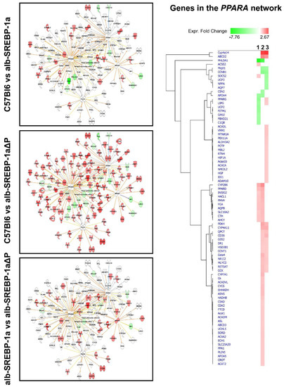 Overlap of the differential hepatic gene expression of the comparisons C57Bl6 vs. alb-SREBP-1a, C57Bl6 vs. alb-SREBP-1a∆P, and alb-SREBP-1a vs. alb-SREBP-1a∆P to interaction networks centered to PPARA or ACOX-1. Genes with differential gene expression (1.5-fold, p-value < 0.05) were used for IPA core analyses. Color code indicates knowledge-based interpretation (amber: predicted activation, blue: predicted inhibition, yellow: inconsistence with state of downstream molecule, black: effect not predicted) and different abundance (red: increase in condition 1, green: decrease in condition 1) based on measured expression. Different abundance of network genes is indicated in detail in the hierarchical cluster with 1: C57Bl6 vs. alb-SREBP-1a, 2: C57Bl6 vs. alb-SREBP-1a∆P, and 3: alb-SREBP-1a vs. alb-SREBP-1a∆P.