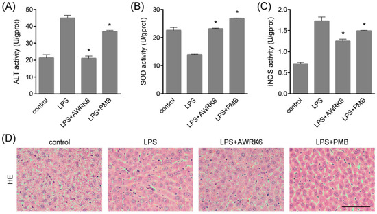 AWRK6 relieved lipopolysaccharide (LPS)-induced liver injury in mice. The mice were administrated with LPS (50 mg/kg) by intraperitoneal injection. AWRK6 (10 mg/kg) or PMB (10 mg/kg) was administered intraperitoneally 1 h after LPS and an equal volume of sterile saline was used as a negative control. (A) The protective effect of AWRK6 on enhanced ALT activity in LPS-treated mice liver, assayed by Alanine aminotransferase Assay Kit. (B) The effect of AWRK6 on SOD activity in LPS-treated mice liver assayed by Superoxide Dismutase Assay Kit. (C) The effect of AWRK6 on iNOS activity in LPS-treated mice liver, assayed by Nitric Oxide Synthase Assay Kit. (D) Histologic changes of liver tissues upon LPS and AWRK6 treatment, stained with HE. (E) Micrographs of liver sections stained with MPO antibody. (F) The analysis of liver sections stained with MPO was carried out using ImageJ. * p < 0.05 compared with the LPS groups. Scale bar indicates 100 μm.