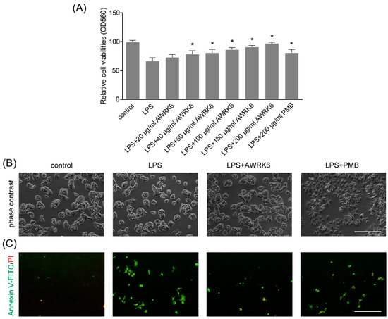 AWRK6 inhibited LPS-induced liver cell apoptosis in HepG2 cells. (A) The viabilities of HepG2 liver cells treated with LPS (40 μg/mL) with/without AWRK6 for 24 h, examined by MTT assay. (B) The cells treated with LPS and AWRK6 (200 μg/mL) were observed under phase contrast microscope. (C) The cell apoptosis was detected by Annexin V-FITC/PI staining followed by fluorescence microscopy. (D) The apoptotic cell number in the results of Annexin V-FITC/PI staining was analyzed by ImageJ. (E) The protein levels of cleaved-caspase 9, BAX and Bcl-2 were analyzed by western blotting. (F) The results of western blotting were quantified using ImageJ. Bar indicates 100 μm. * p < 0.05 compared with the LPS groups.