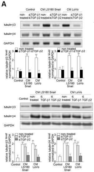 The expression of tubulin-β3 and -β4 are mainly regulated by cytokines belonging to the transforming growth factor-β (TGF-β) family. (A) HMEC-1 cells were cultured in medium supplemented with conditioned medium (CM) isolated from invasive (LS180 Snail, LoVo) colon cancer cells where TGF-β1 and/or TGF-β2 were depleted (d. TGF-β1 and/or d. TGF-β2) for 216 h. Then levels of tubulin-β3 and tubulin-β4 were analyzed by Western blot assay. The protein levels are normalized to GAPDH. The results are provided as means ± SD (n = 3); ** p < 0.01. The blots are representative of three independent experiments. (B) Simultaneously, the phosphorylation of tubulin-β3 in microtubules fraction was determined by immunoprecipitation assay with rabbit antibodies recognizing phosphorylated protein followed by Western blot with mouse antibodies bound to tubulin-β3. Additionally, the input was analyzed with mouse antibodies recognizing tubulin-α. The results are provided as means ± SD (n = 3); * p < 0.05, ** p < 0.01.