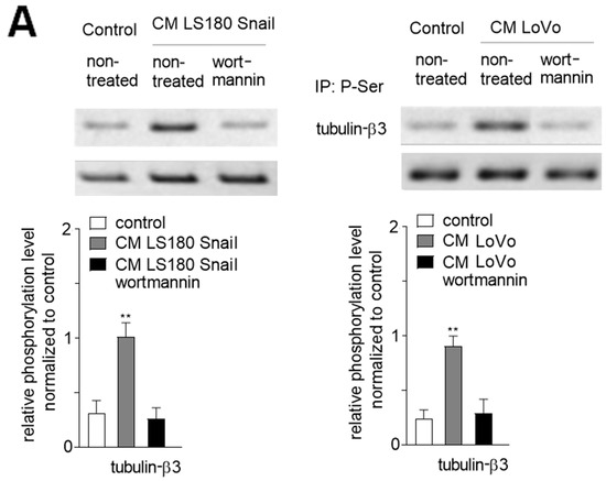 Conditioned media (CM) isolated from invasive (LS180 Snail, LoVo) colon cancer cells induce upregulation of tubulin-β3 and tubulin-β4 in Human Microvascular Endothelial (HMEC-1) cells. (A) HMEC-1 cells were cultured in medium supplemented with CM isolated from pre-invasive (LS180) and invasive (LS180 Snail, LoVo) cancer cells for 216 h, and then the levels of tubulin-β3 and tubulin-β4 were analyzed by Western blot assay. The protein levels are normalized to GAPDH. The results are provided as means ± SD (n = 3); ** p < 0.01. The blots are representative of three independent experiments. (B) Simultaneously, the phosphorylation of tubulin-β3 and tubulin-β4 in microtubules fraction was determined by immunoprecipitation assay with rabbit antibodies recognizing phosphorylated proteins followed by Western blot with mouse antibodies bound to tubulin-β3 or -β4. Additionally, the input was analyzed with mouse antibodies recognizing tubulin-α. The results are provided as means ± SD (n = 3); ** p < 0.01.