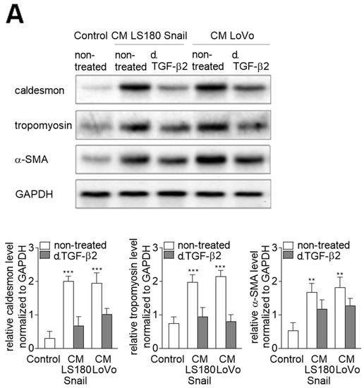Phosphorylation of tubulin-β3 in CAF-like cells is the response for contraction protein expressions. (A) HMEC-1 cells were cultured in medium supplemented with conditioned medium (CM) isolated from invasive (LS180 Snail, LoVo) colon cancer cells where TGF-β2 was depleted (d. TGF-β2) for 216 h or where (B) tubulin-β3 were silenced (siRNA t. β3), or phosphorylation of tubulin-β3 were inhibited by wortmannin. Then, the levels of contraction proteins (caldesmon, tropomyosin, and α-SMA) were determined by Western blot assay. The protein levels are normalized to GAPDH. The results are provided as means ± SD (n = 3); ** p < 0.01, *** p < 0.005. The blots are representative of three independent experiments.