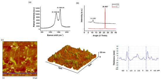 Characterization of GO by (a) Raman, (b) XRD (C is graphite), and (c) atomic force microscopy (AFM). Analysis of GO performed on tapping mode showing topography and thickness.
