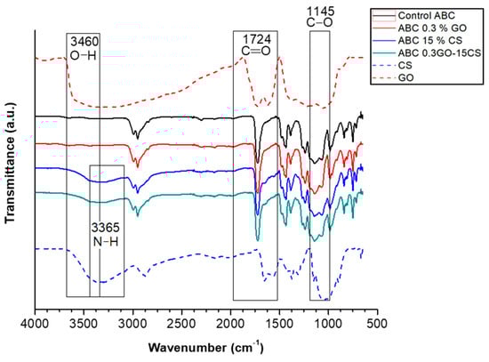ATR-FTIR spectra of ABCs, CS, and GO. Control ABC corresponds to ABC without fillers.