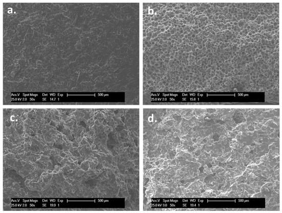The SEM images (50×) of (a) control ABC, (b) ABC with 0.3% GO, (c) ABC with 15% CS, and (d) ABC with 0.3% GO and 15% CS samples.