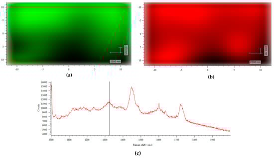 The distribution map of the GO obtained by Raman spectroscopy was used to evaluate its dispersion in the ABCs matrix. The regions used to identify the load and the matrix were determined from the characteristic bands of each component previously measured. In Figure 4a, the green color corresponds to the nanosheets of GO and the black color to the PMMA matrix, while in Figure 4b the red color corresponds to the matrix and the black color to the GO. In both figures, it is observed that the GO is well distributed within the ABCs matrix, which can be beneficial for mechanical reinforcement. Figure 4c shows the Raman spectrum obtained for the ABC sample, in which, 1324 cm−1 is indicated like the Raman shift used as a marker for the GO. Other authors have reported similar findings on GO dispersed in different matrices, such as inorganic silica particles [] or polymeric substrates [,], where Raman spectroscopy showed a comparable surface pattern, concluding the homogeneous distribution and compatibility of GO across the respective matrices.