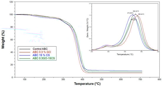 The TGA curves of the ABCs studied are shown in Figure 5. The thermal stability of the ABCs is reduced with the addition of GO or CS at temperatures below 400 °C. On the other hand, thermal stability increases with the addition of both fillers simultaneously, demonstrating a good dispersion of GO through the polymer matrix. The temperature, at which the maximum mass loss rate for formulations occurs, represented by the peaks of the graph of the first derivative of the TGA (DTGA), is increased by the presence of the GO and is decreased by the presence of the CS due to the individual thermal behavior of each component.