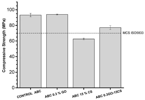 Compressive strength of the control ABC and experimental cements formulated with graphene oxide and chitosan. The dotted line indicates the minimum compressive strength (MCS) threshold defined by ISO5833.