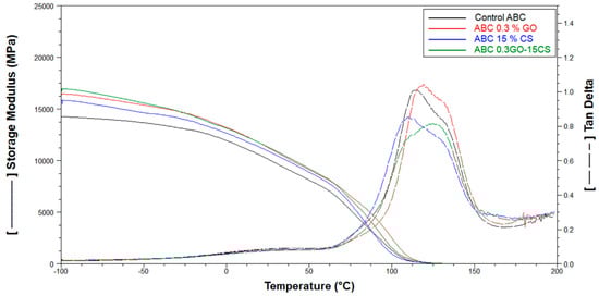DMA results for the control ABC and experimental cements formulated with graphene oxide (GO) and chitosan (CS).