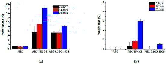 Swelling properties are fundamental in the cell-biomaterial interactions []. Water absorption of PMMA ABCs is known to be very low due to their hydrophobic nature [], which leads to the in vivo formation of a fibrous membrane around the cement. In this work, the hydrolytic behavior of the experimental ABCs will be crucial due to the incorporation of a biodegradable component which will influence the tissue interactions. From the results shown in Figure 8a, it can be observed that when the samples are immersed in Dulbecco’s phosphate buffered saline (PBS), the absorption of water increases with the immersion time. The formulation containing only CS, had the highest water uptake at 14 and 21 days, mainly due to the higher porosity of this nanocomposite, observed by SEM (Figure 3c) but also, to the hydrophilicity of CS []. The water absorption of the ABC 0.3GO–15CS was lower which can be attributed to the formation of hydrogen bonds between CS and GO. As far as degradation behavior is concerned, according to Figure 8b, the most significant weight loss of ABCs occurs in that modified only with CS because this is a bioresorbable polymer that is hydrolyzed in aqueous media []. Nevertheless, weight loss of any experimental cement was not very high, which can guarantee the maintenance of their mechanical properties.