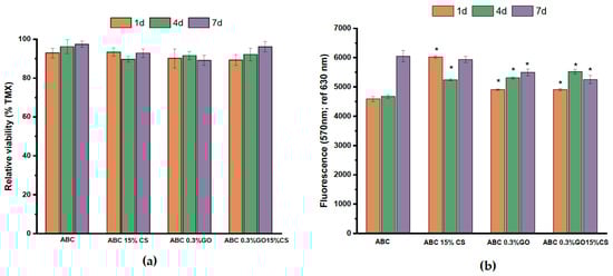 (a) Cell viability of human osteoblasts in the presence of extracts of ABCs taken after 1, 4, and 7 days; (b) Direct Alamar Blue results for control ABC and modified ABCs over a period of 1, 4, and 7 days. Results are the mean ± SD. Statistical analysis (n = 12) for each group was performed comparing experimental ABCs samples respect to ABC group at a significance level of p < 0.01.