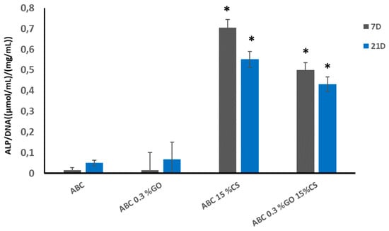 Biochemical detection of ALP activity after seven and 21 days of incubation was used as an indicator of osteoblast phenotype []. Figure 10 shows that the modification of ABCs with chitosan clearly enhanced ALP activity from the early stages, thus inducing osteoblastic activity in both experimental ABC 15% CS and ABC 0.3GO-15CS groups. Although researchers Unagolla and Jayasuriya confirmed that the GO increased the activity of ALP PCL scaffolds [], in this research we found that the greatest effect on the ALP activity was due to chitosan. This polysaccharide has been well studied for bone tissue engineering as osteoconductive and osteoinductive material [], since it induces the proliferation of osteoblast and mesenchymal cells, and induces in vivo neovascularization []. Likewise, other researchers indicated that both GO and CS have a high potential in orthopedic tissue engineering [] thanks to the fact that they have shown an increase in the proliferation of chondrocytes []. They induce attachment and proliferation of mouse mesenchymal stem cells (MSCs) and stimulate expression of the osteogenic gene osteocalcin, thus leading to differentiation of MSCs into bone []. They are cytofriendly to rat osteoprogenitor cells, enhance differentiation of MSCs into osteoblasts, and also accelerate bridging of the rat tibial bone defect with increased collagen deposition []. Additionally, they promote new bone formation on cranial defects of critical size in Wistar rats [].