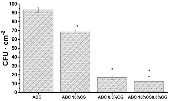 Antibacterial activity of ABCs loaded with CS and GO was evaluated versus Gram-negative bacterium E. coli (DH5α). Bacterial concentration was estimated spectrophotometrically at 600 nm and adjusted with sterile PBS to an OD600 equivalent to 108 CFU/mL. The ability of bacteria to form biofilms was analyzed by colony-forming units (CFU) determined by standardized plate counting agar techniques. Briefly, sample discs of 10 mm diameter were placed into a separate well of a 24-well plate with the test surface facing up. The plate was introduced in a plastic container wet filter paper beneath to maintain a relative humidity of 90%. 100 µL of test inoculums (105 CFU·cm−2) prepared in 1/500 diluted Nuria Broth medium (Sparks, MD, USA, Difco) were placed onto the substrates and incubated for 24 h at 37 °C. Afterwards, samples were washed with 1 mL of PBS, (pH 7.2) and the numbers of CFU recovered from each sample disks were determined by standardized plate counting agar techniques and referred as CFU (N)/cm2. The mean reported for each concentration of filler was based on three replicates.