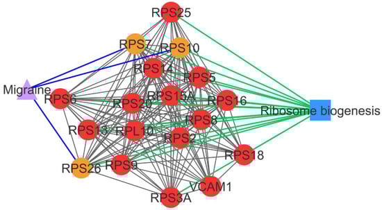 PCOS–disease subnetwork 1. This subnetwork highlights shared proteins and one shared pathway (ribosome biogenesis) between PCOS and migraine. Different coloring of nodes and lines represents PCOS-related proteins (red), shared proteins (orange), PCOS–disease interactions (blue), and protein–pathway interactions (green). Circle nodes refer to PCOS-related proteins, triangle nodes refer to disease, and square nodes refer to pathway.