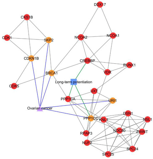 Subnetwork 1 was enriched with ribosomal proteins that are involved in ribosome biogenesis or protein translation (Figure 2). In subnetwork 8, long-term potentiation was identified as a significant pathway, where PPP1CC and PPP1CA directly interacted with three PCOS-ovarian cancer-shared PCOSrps—i.e., BRCA1, PPP1CC, and URI1—and indirectly interacted with two shared PCOSrps (CDKN1B and SKP2; Figure 3).