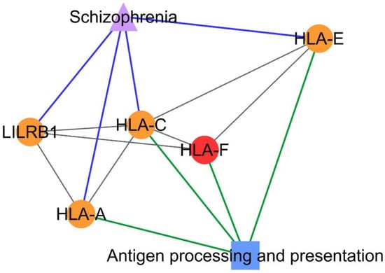 PCOS–disease subnetwork 26. Shared proteins and shared pathway (antigen processing and presentation) between PCOS and schizophrenia were identified from this subnetwork. Different coloring of nodes and lines represents PCOS-related proteins (red), shared proteins (orange), PCOS–disease interactions (blue), and protein–pathway interactions (green). Shape of nodes denotes PCOS-related proteins (circle), disease (triangle), and pathway (square).