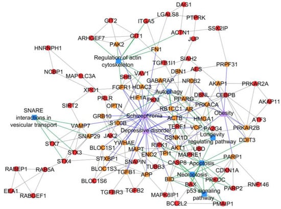 Meanwhile, autophagy, apoptosis, and necroptosis were identified as significant pathways in subnetwork 34, which refers to the association of PCOS with schizophrenia, depressive disorder, and obesity (Figure 5). The PCOS-hypertension association was identified from subnetwork 28, where mitophagy was a significant shared pathway between PCOS and hypertension (Figure 6). Shared pathways for all identified PCOS–disease subnetworks are listed in Table 2. On the other hand, four PCOS–disease subnetworks did not have any significant pathways. Possible reasons for this include: (a) the PCOSrps in those subnetworks are involved in different pathways, (b) there is no pathway information related to PCOSrps in the subnetworks, and (c) outdated or incomplete gene and protein annotations.