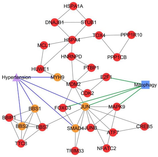 PCOS–disease subnetwork 28. Shared proteins and shared pathway (mitophagy) between PCOS and hypertension were identified from this subnetwork. Different coloring of nodes and lines represents PCOS-related proteins (red), shared proteins (orange), PCOS–disease interactions (blue), and protein–pathway interactions (green). Circle nodes refer to PCOS-related proteins, triangle node refers to disease, and square node refers to pathway.