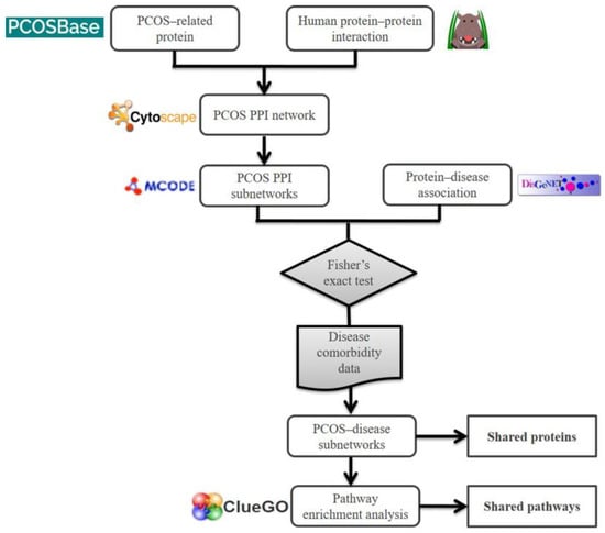 The biological function of the subnetworks were determined from the pathway enrichment analysis using ClueGO [] against the Kyoto Encyclopedia of Genes and Genomes (KEGG) database []. ClueGO was used to identify shared pathways in PCOS and its associated diseases from the PCOS–disease subnetworks. Shared pathways were identified using a hypergeometric test followed by the application of Bonferroni stepdown to calculate the false discovery rate (FDR). Overall method of this study is illustrated in Figure 7.