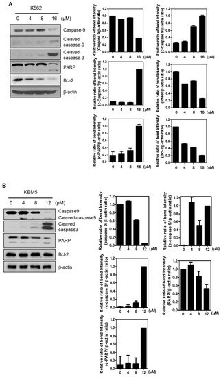 Among bone marrow or blood cancers, leukemia with the abnormal proliferation feature of white blood cells is generally classified into myelogenous leukemia and lymphoblastic leukemia [1]. Chronic myeloid leukemia (CML) is a myeloproliferative disorder of transformed hematopoietic stem cells by the Philadelphia chromosome or the Philadelphia translocation (Ph) of chromosomes 9 and 22 with constitutively activated Bcr-abl tyrosine kinase [2]. Although various chemotherapeutical agents have been developed such as Imatinib mesylate (Gleevec®, Novartis), Busulfan (Myleran®, Busilvex), or Hydroxyurea (Hydrea®, Bristol-Myers Squibb Pharmaceuticals) for the treatment of CML, their therapeutic efficacies have been limited due to their side effects, such as lethargy, fluid retention, thrombocytopenia, nausea, and diarrhea [3,4].