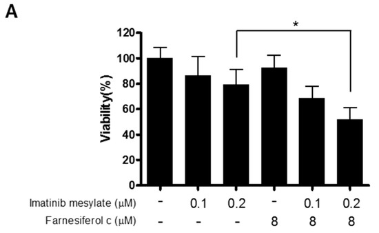 Cytotoxic effect of FC and/or Imatinib in K562 cells, KBM5, U937, and HL-60 cells was examined by using MTT assay according to the method shown in Jung et al.’s paper [6]. The cells (1 × 104 cells per well) were exposed to various concentrations of FC (10, 20, 30, 40, and 50 µM) and/or Imatinib (0, 0.1, 0.2 µM) for 24 h, then with MTT (1 mg/mL) for 2 h, and exposed to DMSO for 20 min. Thereafter, optical density was measured with a microplate reader (Molecular Devices Co., Silicon Valley, CA, USA) at 570 nm. Cell viability was evaluated as a percentage of viable cells in FC and/or Imatinib treated group vs. untreated control.