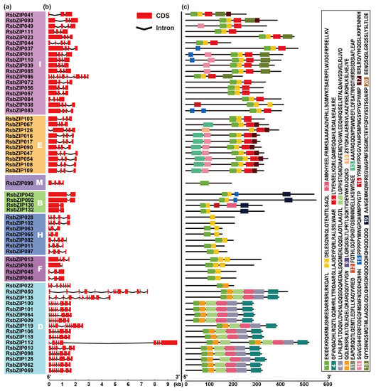 Characterization of radish bZIP genes. (a) The clustering of RsbZIP proteins based on Neighbor-Joining phylogenetic tree. (b) Exon-intron structures of RsbZIP genes. Red box and black line indicate exon and intron, respectively. (c) Distribution of conserved motifs for RsbZIP proteins.