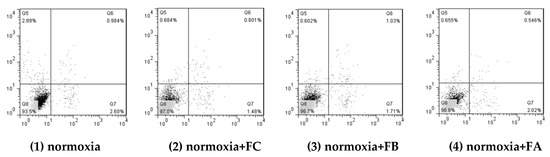 After that, cells viability data were presented in Figure 4, employing flow cytometry. Compared to the normoxic group, hypoxia for 24 h resulted in marked increase of the apoptosis rates of PASM cells (p < 0.01). The apoptosis rate of PASM cell under hypoxia (2% oxygen) had increased to 21.42%, which was 5.60 times higher than the normoxia. Under hypoxia, the apoptosis rates of PASM cell treated with 250 µg/mL FA, FB and FC had significantly decreased 10.05%, 12.50%, and 15.06% respectively (p < 0.01) when compared to the hypoxia control group (21.42%). Under the normal oxygen condition, three polysaccharide fractions also can inhibit cells apoptosis. Among them, FC fraction showed the best anti-hypoxia effect under both the limited oxygen and normoxia.
