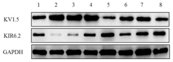 The effect of three fractions A, B and C on the expressions of KV1.5 and KIR6.2 under hypoxia with 2% oxygen content. Western blot analysis was implemented to present the expression of proteins. Densitometry analysis was employed to analyze the densities of brands. Data are presented after normalization by GAPDH. PASM cells were treated by FA, FB, FC (200 μM) for 24 h. All results were expressed in the form of means ± SD (n= 3). 1: control group under normal oxygen; 2: Fraction A group under normal oxygen; 3: Fraction B under normal oxygen; 4: Fraction C group under normal oxygen; 5: control group under hypoxia; 6: Fraction A group under hypoxia; 7: Fraction B group under hypoxia; 8: Fraction C group under hypoxia.