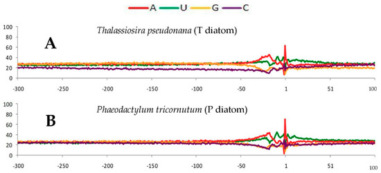 (1) Two diatoms (T. pseudonana and P. tricornutum). As shown in Table S1, the two diatoms have similar nucleotide frequencies in the whole 400 nt regions, and there is a common trend of A>U>G>C. In the NUE region for both diatoms (Figure 1A,B), A and U increase almost concordantly at first, then decrease after reaching a peak.