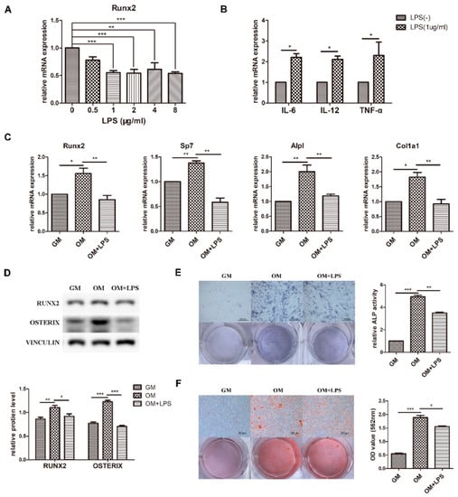- Guo, C.; Yuan, L.; Wang, J.; Wang, F.; Yang, X.; Zhang, F.; Song, J.; Ma, X.; Cheng, Q.; Song, G. Lipopolysaccharide (LPS) Induces the Apoptosis and Inhibits Osteoblast Differentiation Through JNK Pathway in MC3T3-E1 Cells. Inflammation 2014, 37, 621–631. [Google Scholar] [CrossRef] [PubMed]