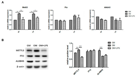 m6A methyltransferase and demethylase expression during osteogenesis and inflammation. MC3T3-E1 cells were cultured in osteogenic medium with 1 μg/mL LPS for 3 days. (A) The mRNA expression of Mettl3, Fto, and Alkbh5 was quantified by qRT-PCR. Gapdh was used as an internal control. (B) The protein levels of METTL3, FTO, and ALKBH5 were assessed by western blotting and normalized to that of β-actin. The results are shown as the mean ± SD (n = 3). * p < 0.05, ** p < 0.01, *** p < 0.001.