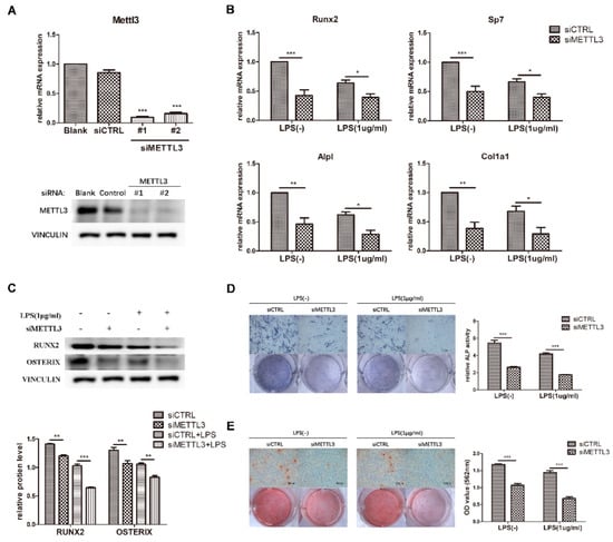 Accumulating evidence has pointed out the importance of m6A methylation in cellular function and fate control, while aberrant changes in methyltransferases and demethylases result in malfunction or diseases [,,]. A recent in vivo study demonstrated that the reduced m6A modifications in bone marrow mesenchymal stem cells (BMSCs) disrupt the osteogenic and adipogenic responses induced by parathyroid hormone, resulting in severe bone loss and excessive adipose accumulation []. Our previous study also showed that METTL3 loss inhibited the osteogenic differentiation potential of BMSCs []. Nevertheless, little is known about the role of METTL3 in osteoblast function during the inflammatory process. It is also unclear whether METTL3 affects the LPS-induced inflammatory response and its regulatory pathway in osteoblasts. Therefore, our study aimed to investigate the effect and underlying molecular mechanism of METTL3 on osteoblast differentiation and inflammatory reactions.