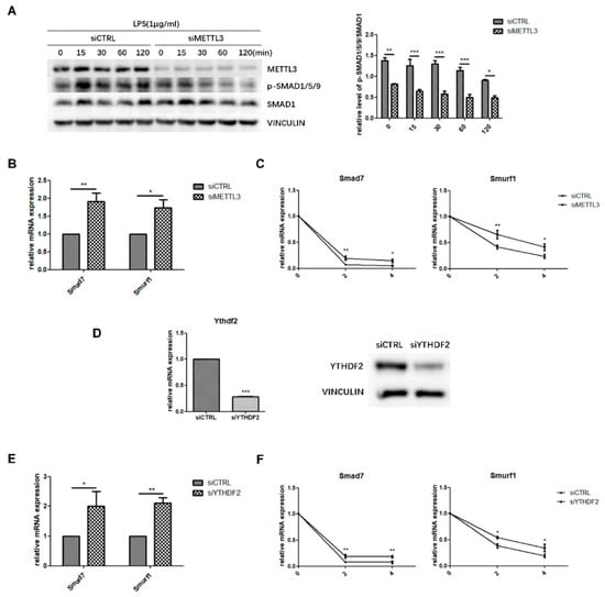 Effect of METTL3 or YTHDF2 knockdown on Smad-dependent signaling. (A) siMETTL3- or siCTRL-transfected cells were cultured in osteogenic medium for 60 h and then treated with 1 μg/mL LPS for 0–120 min. Next, Smad1/5/9 phosphorylation was examined by western blotting. p-Smad1/5/9/Smad1 values represent the relative level of signaling activation. VINCULIN was used as an internal reference. (B,E) MC3T3-E1 cells were transfected with siRNA (METTL3, YTHDF2, or negative control) and cultured in osteogenic medium for 60 h. Smad7 and Smurf1 mRNA levels were detected by qRT-PCR. Gapdh was used as an internal control. (C,F) The mRNA expression of Smad7 and Smurf1 was examined by qRT-PCR in siRNA (METTL3, YTHDF2, or negative control)-transfected cells with osteogenic induction and 0, 2, and 4 h of treatment with 5 μg/mL actinomycin D. Gapdh was used as an internal control. (D) The transfection efficiency of YTHDF2 knockdown was measured by qRT-PCR and western blotting. siCTRL, cells transfected with negative control siRNA; siYTHDF2, cells transfected with YTHDF2 siRNA. The results are shown as the mean ± SD (n = 3). * p < 0.05, ** p < 0.01, *** p < 0.001.