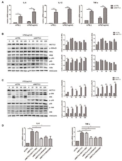 To reveal the signaling pathway by which METTL3 regulates the inflammatory response, we evaluated NF-κB and MAPK signaling activation. Western blotting was performed to detect the phosphorylation levels of IKKα/β, p65, IκBα, ERK, p38, and JNK. The results showed that compared with the control condition, METTL3 depletion remarkably increased the levels of p-ERK, p-p38, p-JNK, and p-p65. In contrast, no obvious changes were observed in the other two components of NF-κB signaling, IKKα/β and IκBα (Figure 5B,C).