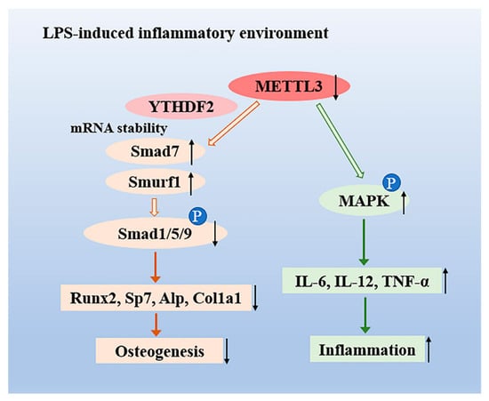 The role of the N6-adenosine methyltransferase METTL3 in an LPS-induced inflammatory model of osteoblasts. METTL3 suppression reduced the activation of Smad-dependent signaling by stabilizing the mRNA transcripts of Smad7 and Smurf1 via YTHDF2 involvement and inhibited osteoblast differentiation in an LPS-induced environment. Moreover, METTL3 depletion increased the expression of IL-6, IL-12, and TNF-α through activating MAPK signaling, thereby promoting the osteoblast inflammatory response.
