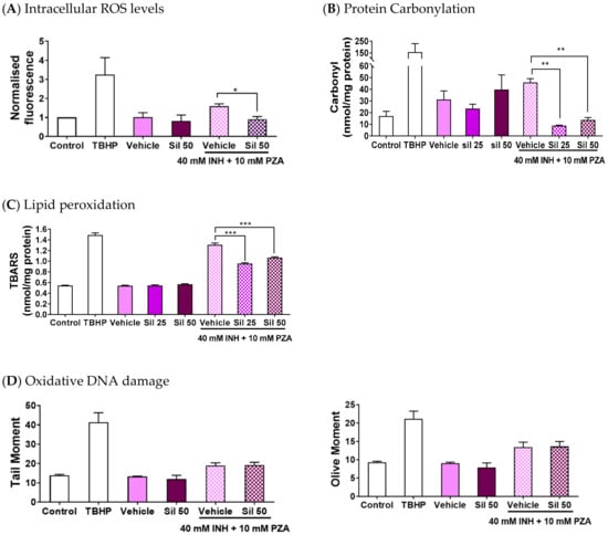 Silibinin reduced reactive oxygen species (ROS) levels and oxidative damage when co-administered with a combination of isoniazid (INH) and pyrazinamide (PZA). Positive controls were treated with the oxidising agent tert-butyl hydroperoxide (TBHP) 200 μM for 2 h. To avoid excessive hepatocyte death, the concentrations of INH and PZA were limited to 40 mM and 10 mM, respectively, when treated in combination (I/P 40/10) over 24 h. (A) 50 μM silibinin reduced intracellular ROS levels (t-test, p = 0.0466). (B) Silibinin decreased carbonylation levels, a marker of oxidative damage in proteins, at 25 μM (one-way ANOVA, p = 0.0015) and 50 μM (one-way ANOVA, p = 0.0023). (C) Silibinin reduced lipid peroxidation levels as measured by the thiobarbituric acid reactive substances (TBARS) assay at 25 μM (one-way ANOVA, p < 0.0001) and 50 μM (one-way ANOVA, p = 0.0007). (D) Silibinin’s reduction of ROS levels at 50 μM was independent of DNA oxidative damage reduction as visually assessed, and as measured quantitatively by tail moment and olive moments. Administration of silibinin alone did not trigger DNA fragmentation. Data represent mean ± S.E.M. of at least two replicates. * p < 0.05, ** p < 0.01, *** p < 0.001 vs. vehicle control co-administered with I/P 40/10.